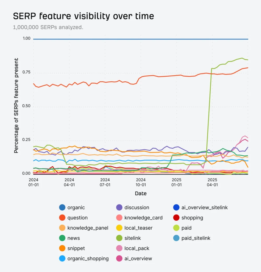 These features have progressively contributed to an increase in "zero-click searches," where users find the information they need without needing to click through to an external website. This trend has been steadily growing over the years, and the introduction of AI Overviews has significantly accelerated this shift.