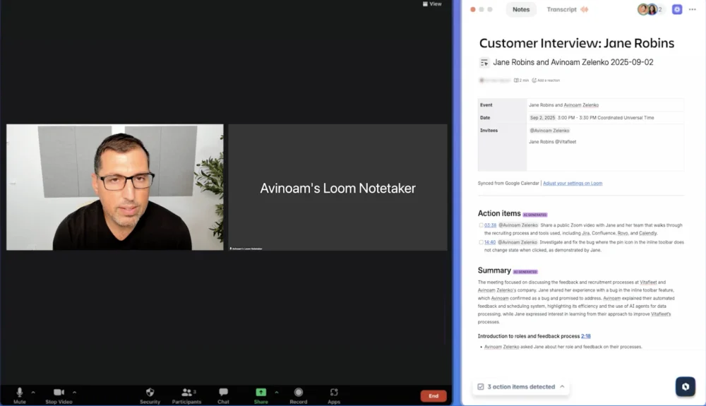 Once a customer selects a time, the process moves into the data capture phase. Zelenko utilizes Loom to record the video calls. This choice is strategic; Loom’s automated transcription services allow the Product Manager to focus entirely on the conversation rather than splitting their attention between the customer and a notepad. By delegating the recording and transcription to an automated service, the "listen versus take notes" tradeoff is removed, ensuring a more human-centric and empathetic interaction.