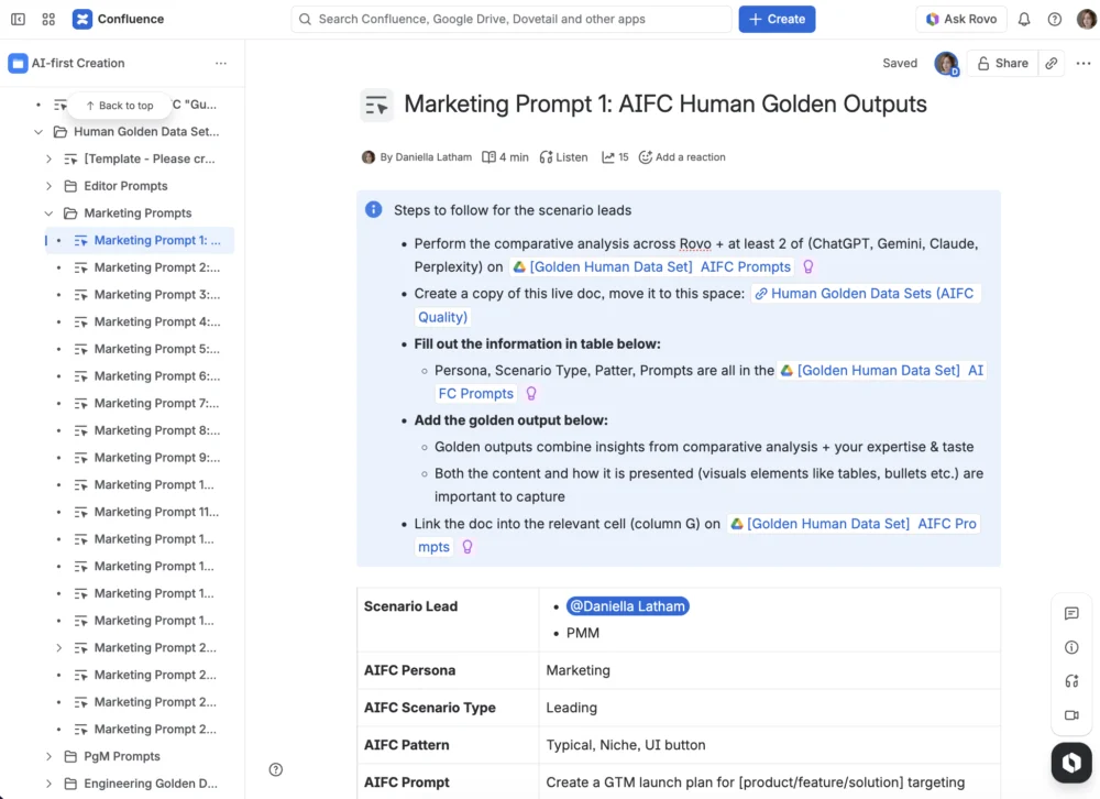 To implement this framework, Atlassian identified and refined 10 to 15 golden prompts for five key personas: Marketing, Sales, Product Management, Engineering, and general Knowledge Workers. Each prompt was designed to capture the specific goals of the persona, the necessary data inputs (context), and the precise requirements of the final output.