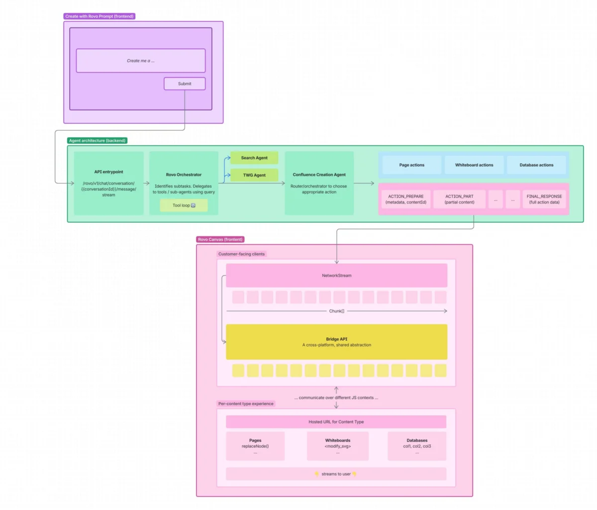 Delivering this generated content to the client required a robust streaming architecture. Atlassian opted against building simplified previews; instead, the canvas renders content using the exact same components used in the standard Confluence experience, embedded within an iframe. This ensures that the AI-generated canvas is fully featured and functional from the moment it appears. To support this, a new streaming API contract was defined, specifying how the LLM should handle different content types.